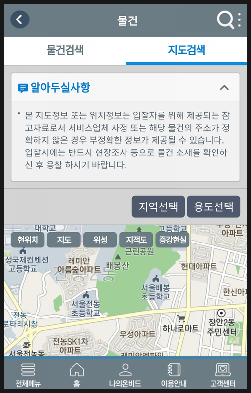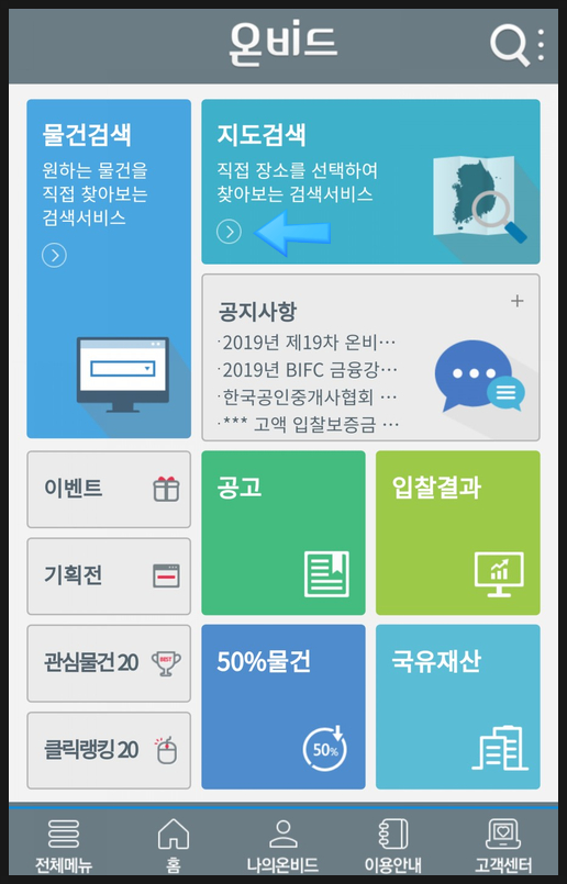 1. 온비드 어플을 실행해 지도검색을 선택합니다.