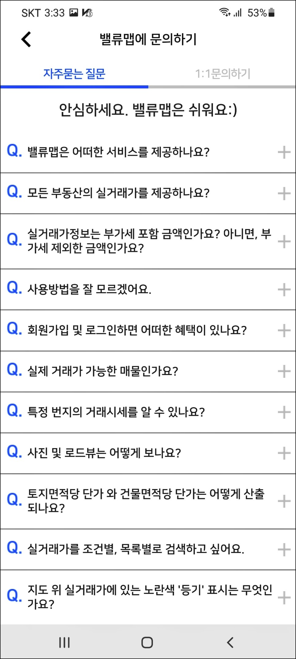 아래와 같이 밸류맵에 문의하기 화면이 나옵니다.