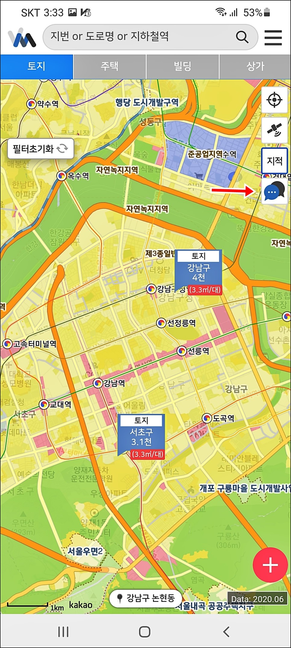 오른쪽 중간에 보면 "지적"이라고 표시된 곳을 누르면