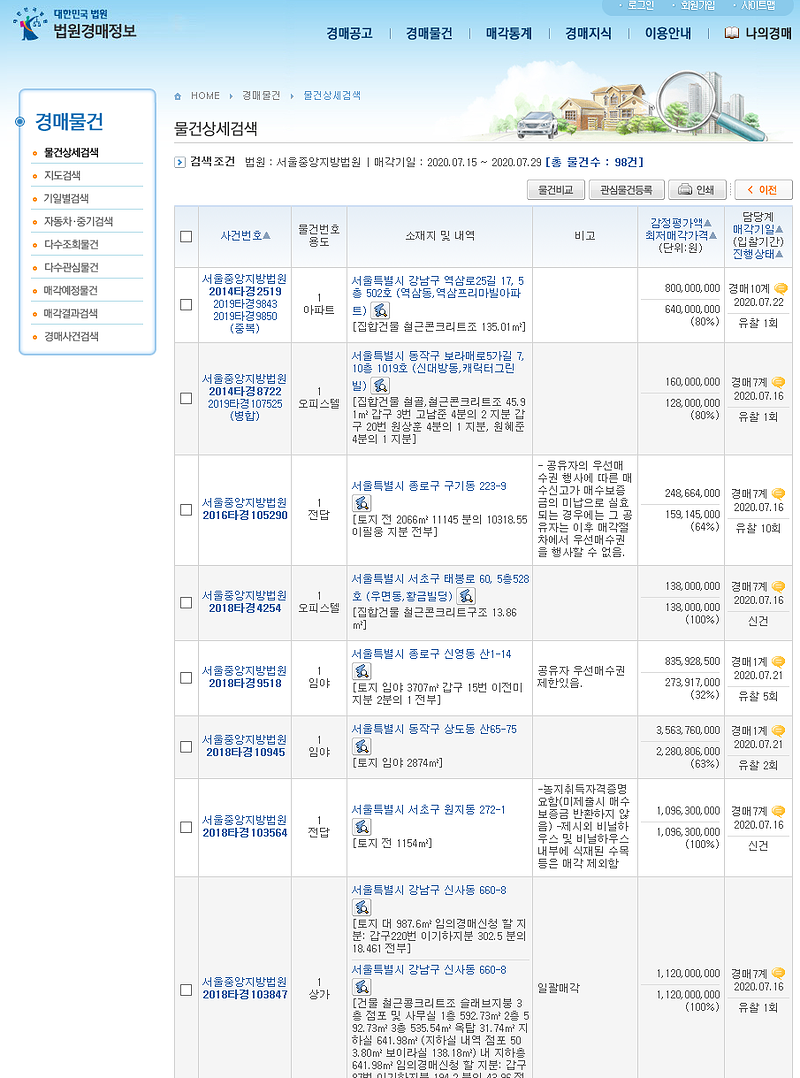 서울중앙지방법원에서 진행중인 경매사건을 검색해 보았습니다.