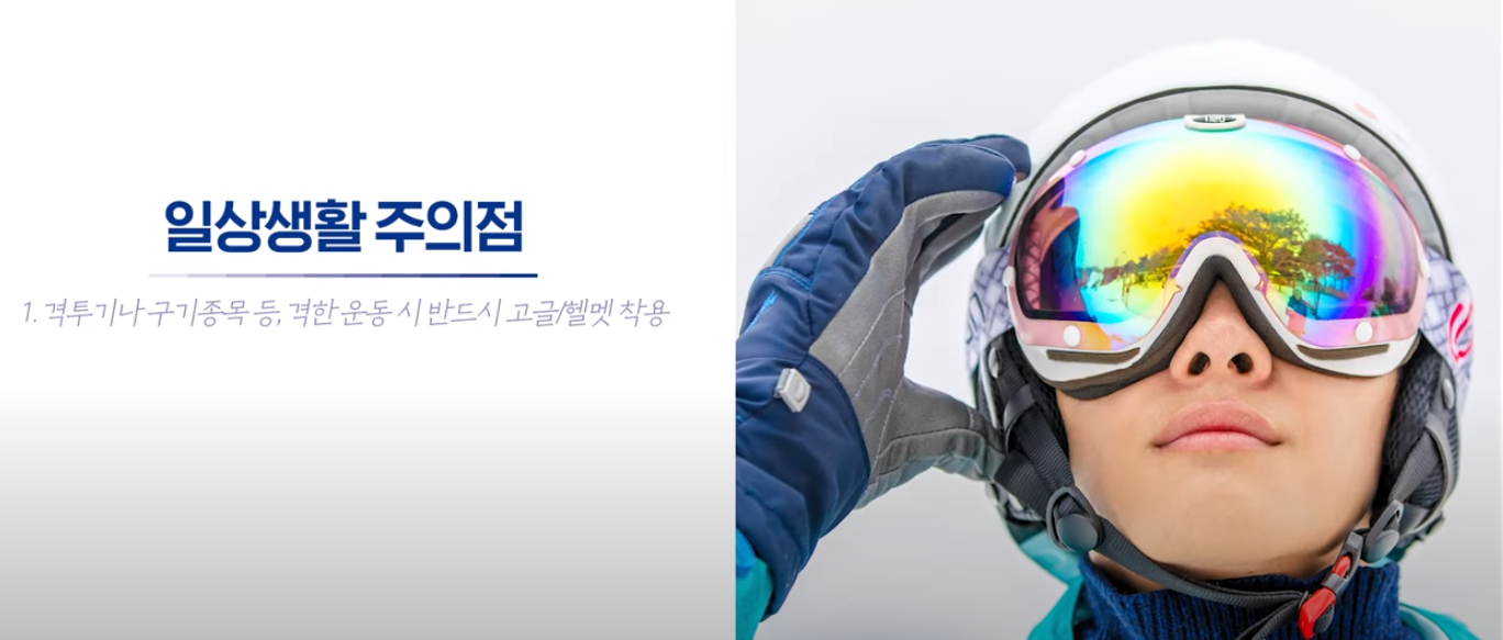 1. 격투기나 구기종목 등, 격한 운동시 반드시 고글/헬멧 착용