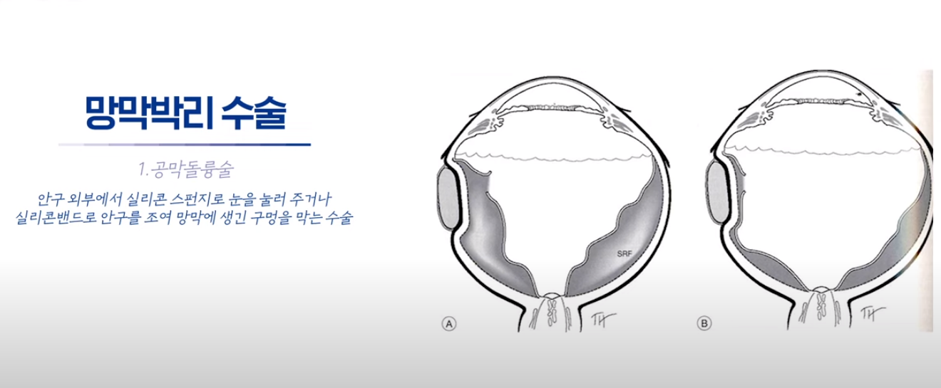 안구 외부에서 실리콘 스펀지로 눈을 눌러 주거나 실리콘밴드로 안구를 조여 망막에 생긴 구멍을 막는 수술